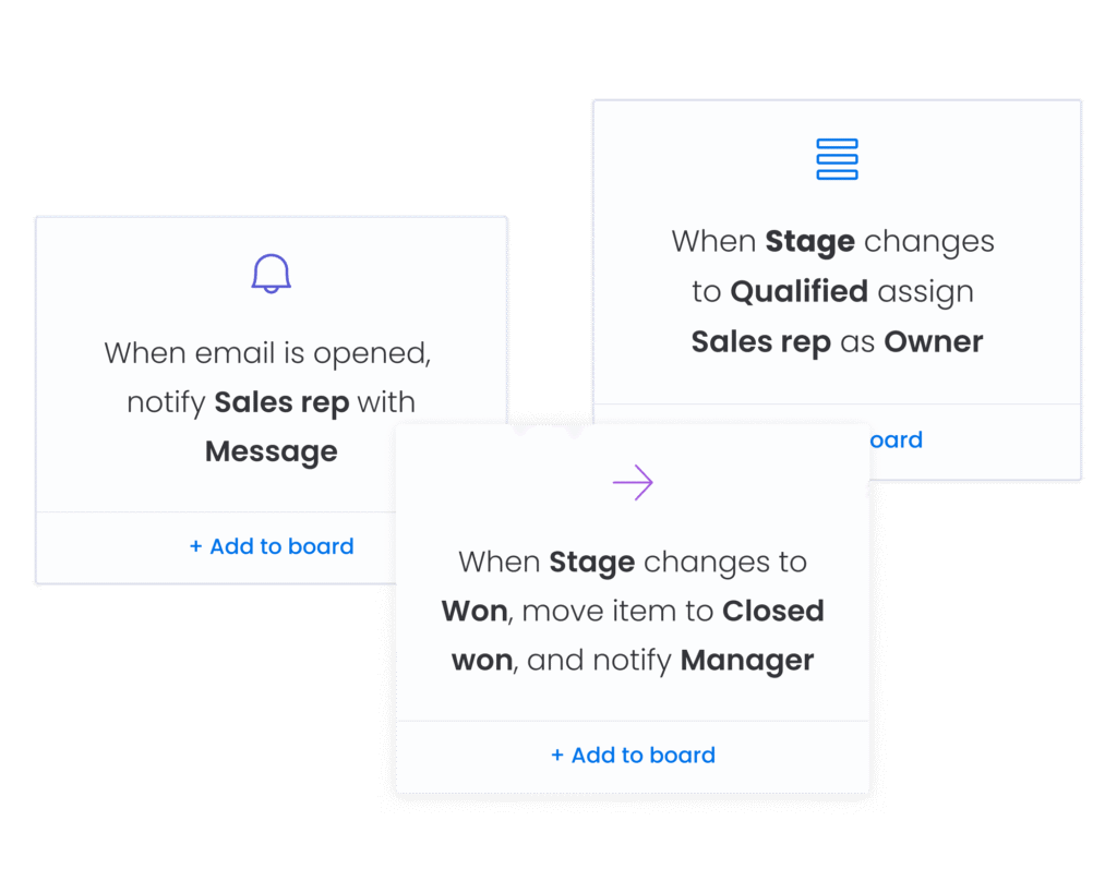 Close more deals by automating repetitive work. Automatically assign leads to reps, set reminders for upcoming activities, get notified when a lead opens an email, and more.